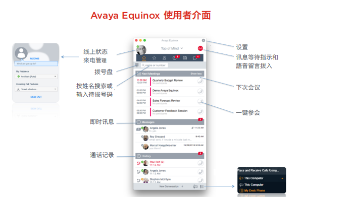 Avaya Equinox 提供了整体化的通信体验,不管是在桌面,还是在 浏览器、移动设备或室内系统上,运行表现都一样完美。当您在不同设备之间来回切换时,通信功能也会根据您的个人设置同步呈现 。