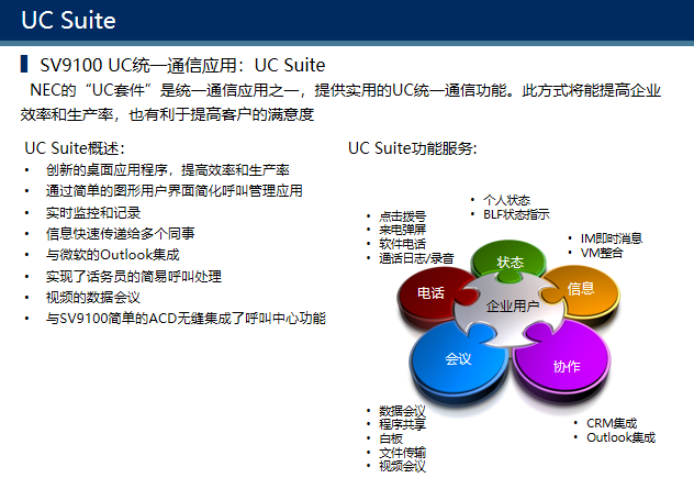 NEC 的中小企业UC套件提供的工具能提高你整个组织的绩效。UC组建/套件给你和你的员工获取最新的生产力増强通信应用,例如用户表示、即时消息、白板、应用共享、 多媒体软电话和UC客户端